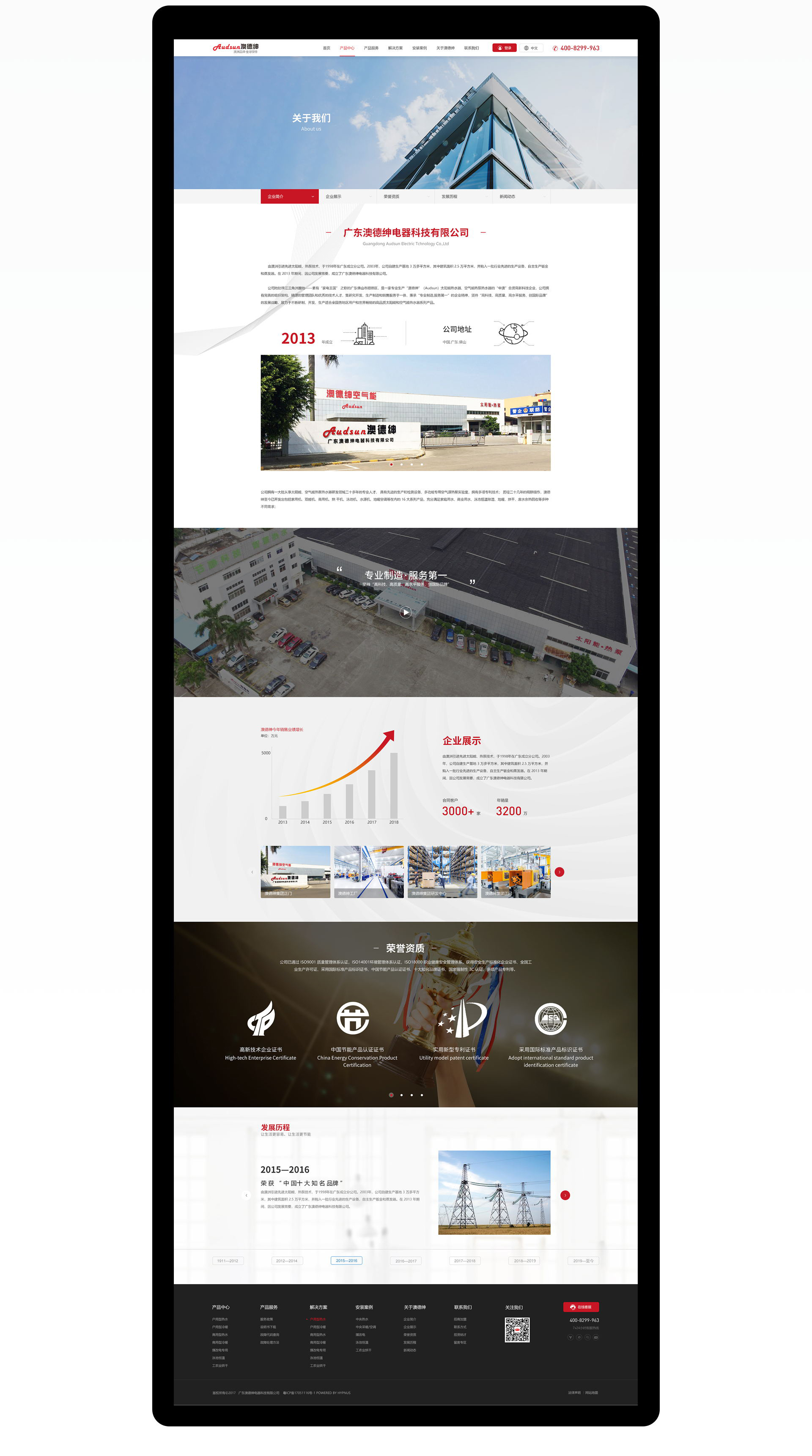 廣東澳德紳電器科技有限公司,由澳洲引進(jìn)先進(jìn)太陽(yáng)能、熱泵技術(shù),于1998年在廣東成立分公司。2003年,公司自建生產(chǎn)基地 3 萬(wàn)多平方米,其中建筑面積 2.5 萬(wàn)平方米,并購(gòu)入一批行業(yè)先進(jìn)的生產(chǎn)設(shè)備,自主生產(chǎn)鈑金和蒸發(fā)器。在 2013 年期間,因公司發(fā)展需要,成立了廣東澳德紳電器科技有限公司。公司地處珠江三角洲腹地——素有“家電王國(guó)” 之稱(chēng)的廣東佛山市順德區(qū),是一家專(zhuān)業(yè)生產(chǎn)“澳德紳”(Audsun)太陽(yáng)能熱水器、空氣能熱泵熱水器的“中澳”合資高新科技企業(yè),公司擁有完善的組織架構(gòu)、精湛的管理團(tuán)隊(duì)和優(yōu)秀的技術(shù)人才,集研究開(kāi)發(fā)、生產(chǎn)制造和銷(xiāo)售服務(wù)于一體,秉承“專(zhuān)業(yè)制造,服務(wù)第一”的企業(yè)精神,堅(jiān)持“高科技、高質(zhì)量、高水平服務(wù)、創(chuàng)國(guó)際品牌”的發(fā)展戰(zhàn)略,致力于不斷研制、開(kāi)發(fā)、生產(chǎn)適合全國(guó)各地區(qū)用戶(hù)和世界暢銷(xiāo)的高品質(zhì)太陽(yáng)能和空氣能熱水器系列產(chǎn)品。