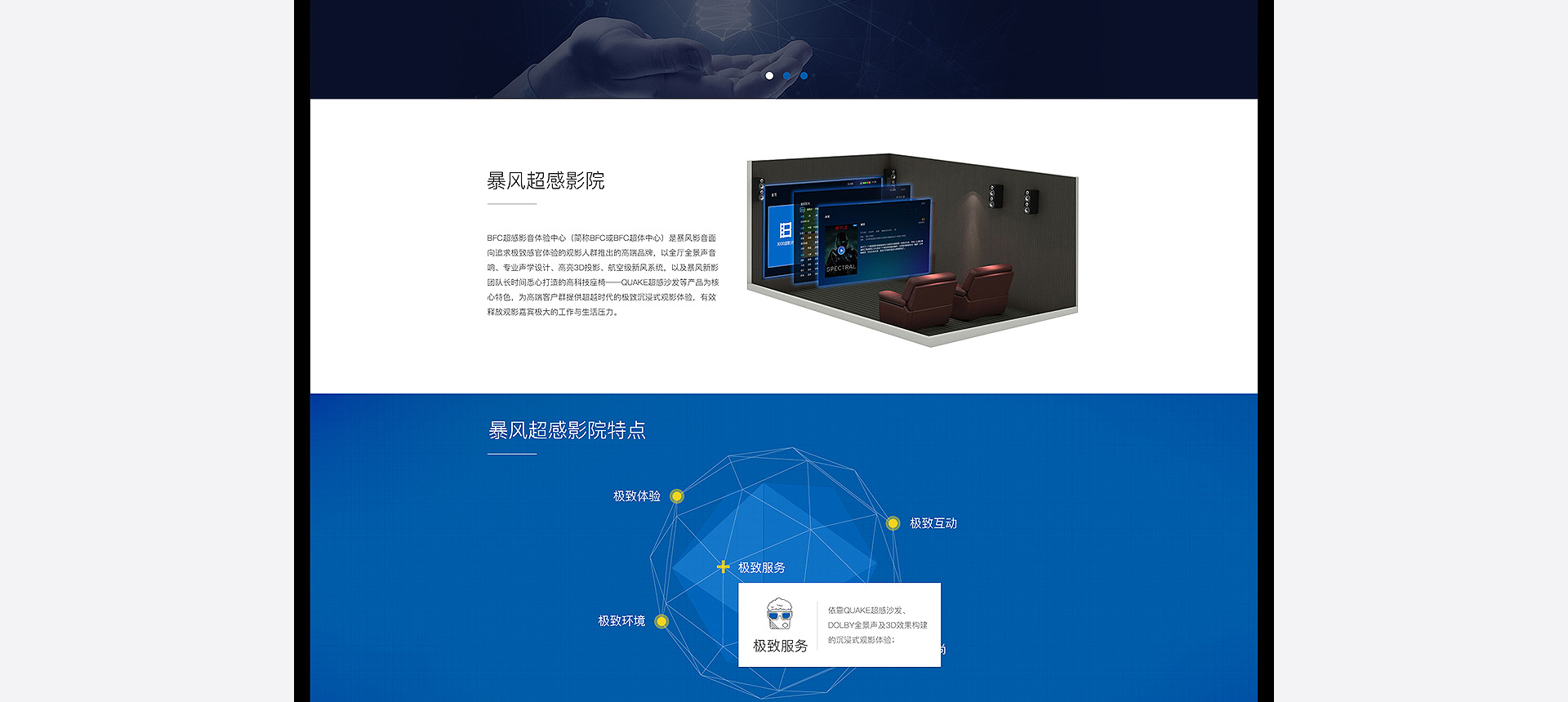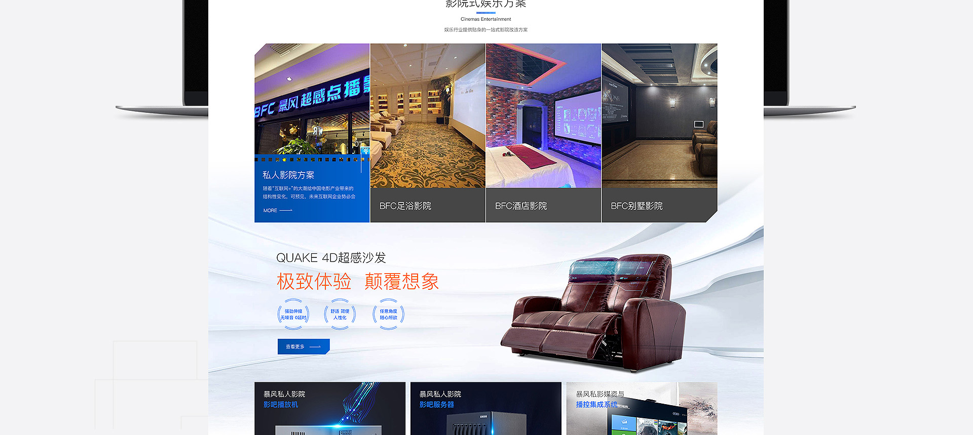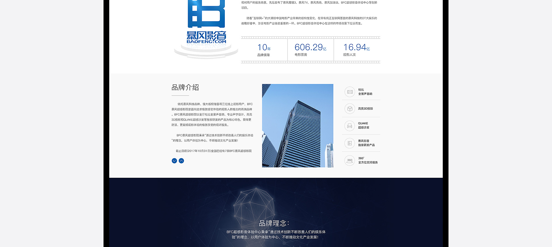 依托暴風(fēng)科技品牌、強(qiáng)大版權(quán)儲備和三億線上觀影用戶,BFC暴風(fēng)超感影院是面向追求極致感官體驗的觀影人群推出的高端品牌。BFC暴風(fēng)超感影院以全廳杜比全景聲音響、專業(yè)聲學(xué)設(shè)計、高亮3D投影和QUAKE超感沙發(fā)等獨家研發(fā)的產(chǎn)品為核心特色,獲得更舒適、更震撼觀影體驗的極致享受的視聽服務(wù)。 BFC暴風(fēng)超感影院秉承“通過...