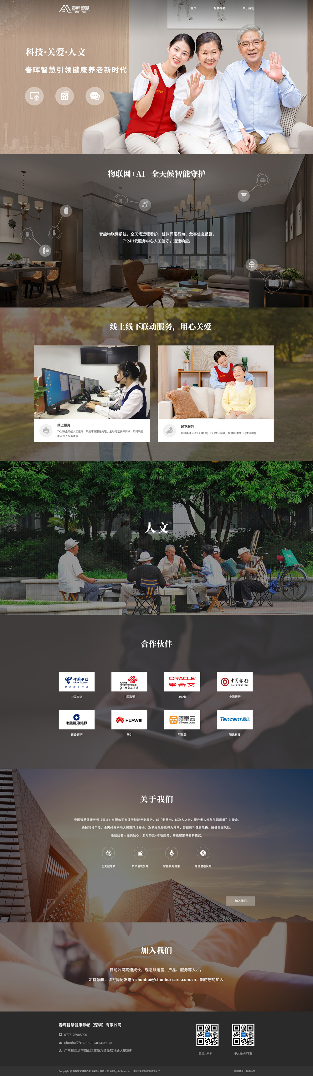 春暉智慧健康養(yǎng)老(深圳)有限公司專注于智能養(yǎng)老服務,以“老吾老,以及人之老,提升老人晚年生活質(zhì)量”為使命, 通過科技手段,全天候守護老人居家環(huán)境安全,及早發(fā)現(xiàn)作息行為異常,智能預判健康隱患,降低潛在風險。 通過給老人提供貼心、及時的云+本地服務,開啟居家養(yǎng)老新模式。