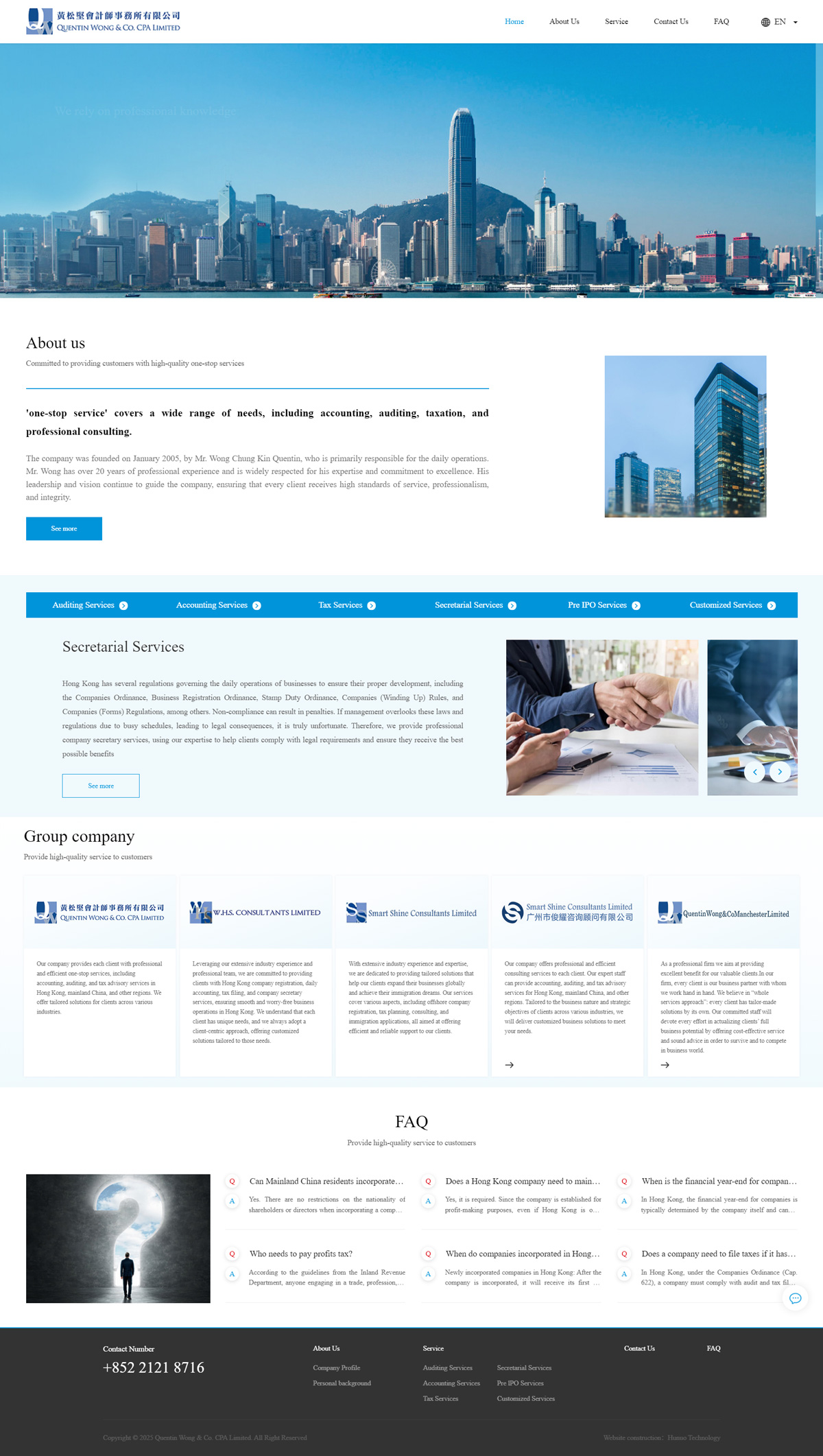黃松堅(jiān)會(huì)計(jì)師事務(wù)所有限公司于2005年1月1日由黃松堅(jiān)先生創(chuàng)辦,至今累積逾19年執(zhí)業(yè)經(jīng)驗(yàn)。日常營(yíng)運(yùn)主要由黃松堅(jiān)先生負(fù)責(zé)。他是一名合資格的香港執(zhí)業(yè)會(huì)計(jì)師,他是香港會(huì)計(jì)師公會(huì)、香港稅務(wù)學(xué)會(huì)及特許公認(rèn)會(huì)計(jì)師公會(huì)資深會(huì)員,主營(yíng)業(yè)務(wù)有:審計(jì)服務(wù),法定審計(jì),非法定審計(jì),法定審計(jì),非法定密計(jì),會(huì)計(jì)服務(wù),稅務(wù)服務(wù),公司秘書(shū)服務(wù)。前期上市服務(wù)等。