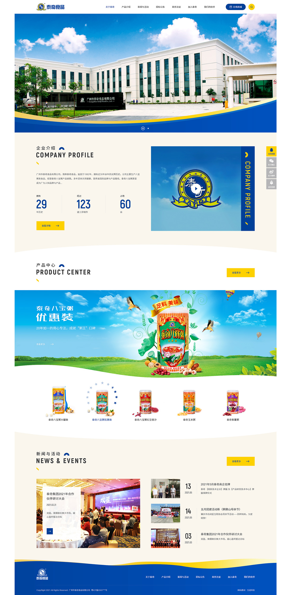 1992年1月23日,成立公司,同年5月推出泰奇第一罐八寶粥,以?xún)?yōu)質(zhì)、天然、有料、健康的食品理念火爆全國(guó),開(kāi)創(chuàng)有飲有食先河,深受經(jīng)銷(xiāo)商及廣大消費(fèi)者所一致喜愛(ài)。通過(guò)30年的發(fā)展與改進(jìn),對(duì)產(chǎn)品品質(zhì)方面進(jìn)行多項(xiàng)改進(jìn)與提升,秉承真材實(shí)料制作,堅(jiān)持零添加,確保健康衛(wèi)生,以?xún)?yōu)越的產(chǎn)品品質(zhì)面向市場(chǎng),這些堅(jiān)持也在市場(chǎng)中成就“做粥專(zhuān)家”的美譽(yù)。目前銷(xiāo)售市場(chǎng)得到更大的拓展與經(jīng)營(yíng),產(chǎn)品在全國(guó)均有銷(xiāo)售,暢銷(xiāo)省港澳,并遠(yuǎn)銷(xiāo)海外國(guó)際,銷(xiāo)量保持穩(wěn)定上升。核心銷(xiāo)售區(qū)域(華南地區(qū))市場(chǎng)部占有率更達(dá)9成,成為該地區(qū)八寶粥第一品牌。
