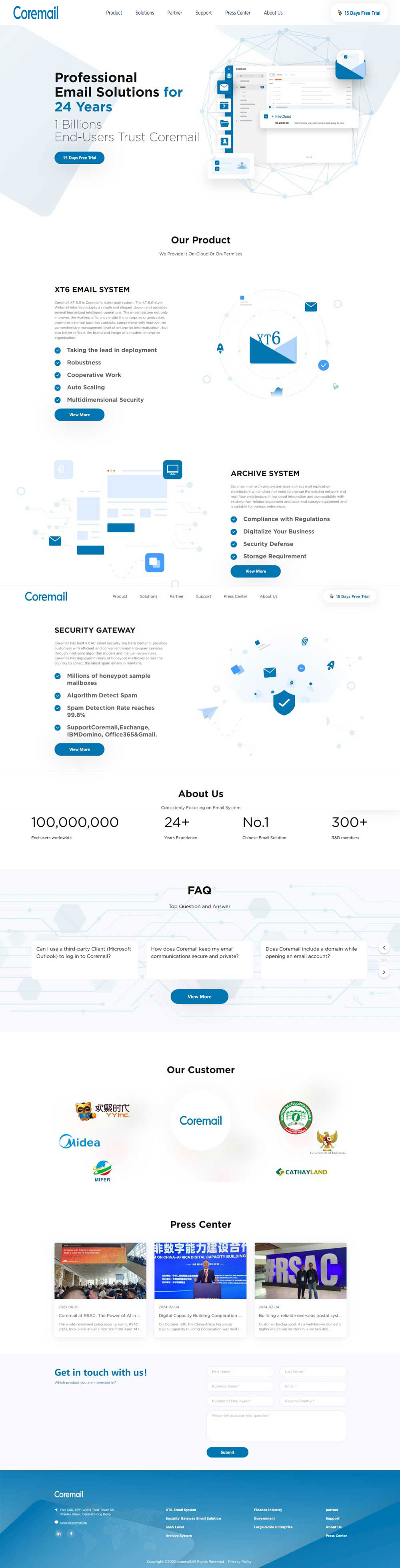 Coremail Hongkong Company Limited(香港訊捷有限公司)是中國領(lǐng)先的電子郵件解決方案服務(wù)提供商。Coremail品牌創(chuàng)立于1999年,2007年由網(wǎng)易戰(zhàn)略投資。公司總部位于廣州,在北京擁有近300名技術(shù)與服務(wù)團(tuán)隊,上海、深圳、廈門、重慶、武漢等地。Coremail專注于企業(yè) 郵箱24年,郵箱技術(shù)領(lǐng)先,擁有超過10億終端用戶。我們?yōu)檎⒔逃?、金融等提供郵件系統(tǒng)相關(guān)產(chǎn)品和解決方案行業(yè),以及各種企事業(yè)單位。