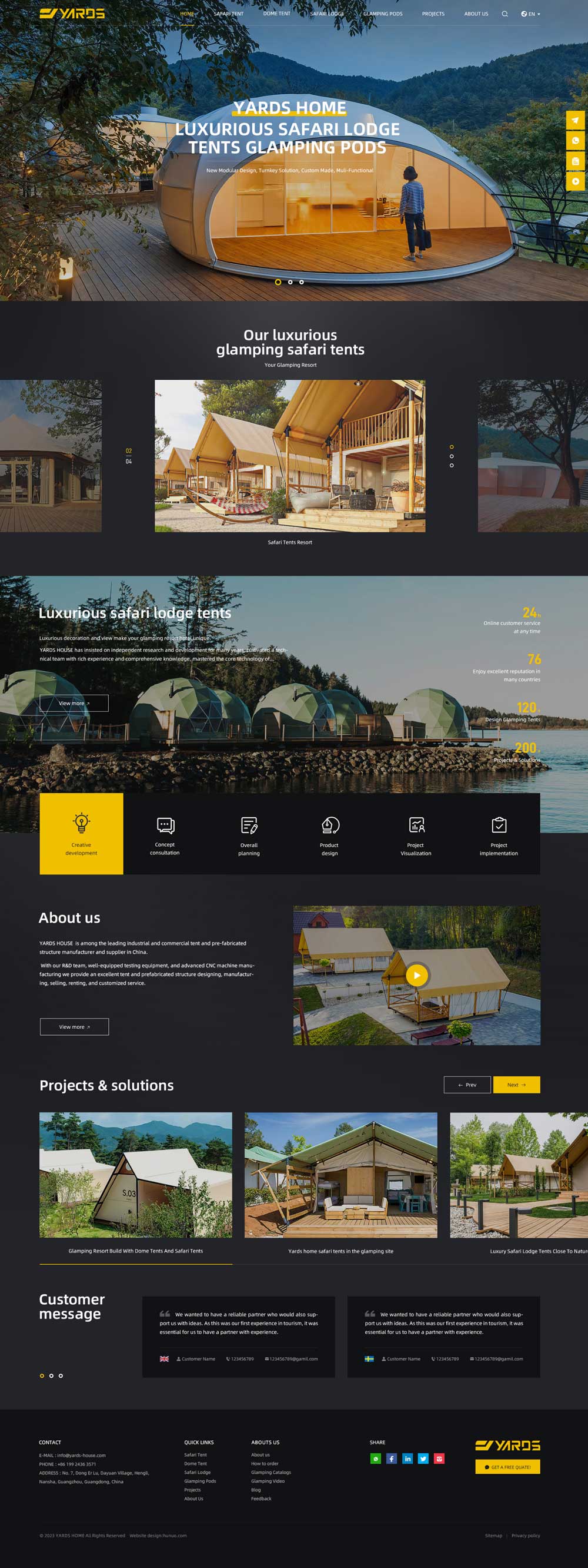 YARDS帳篷分布在全球120多個國家的許多美麗的地方。四種類型的半永久性戶外結(jié)構(gòu):狩獵帳篷、豪華野生帳篷、狩獵小屋帳篷、測地線圓頂和吊艙,每種都有十幾種不同的尺寸和功能。各種帳篷可以作為一個完整的包裝購買,也可以定制設(shè)計和制造,以滿足豪華露營企業(yè)主和實際場地的限制。